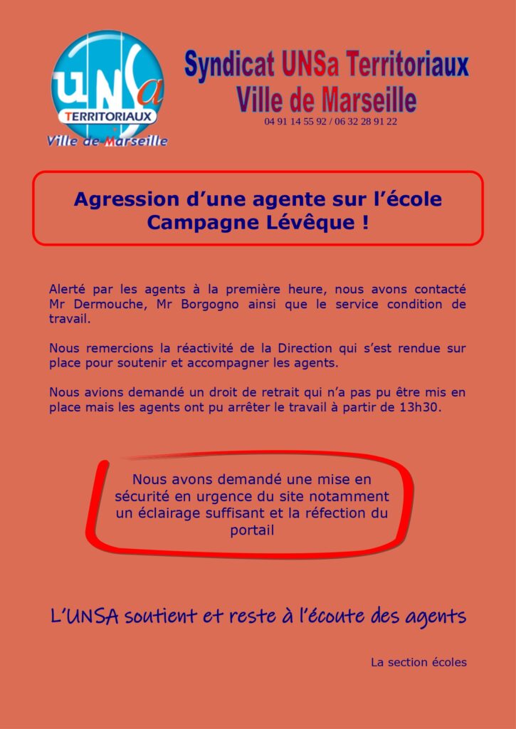 École : Agression d’une agente le 7/10/2025Par UNSA_Marseille / 8 octobre 2025 Publications similaires : Tract CR écoles du 29 août 2025 Livret « Aide à l’utilisation de Maelis » Courrier « Horaires durant les maintenances » du 20/08/2025